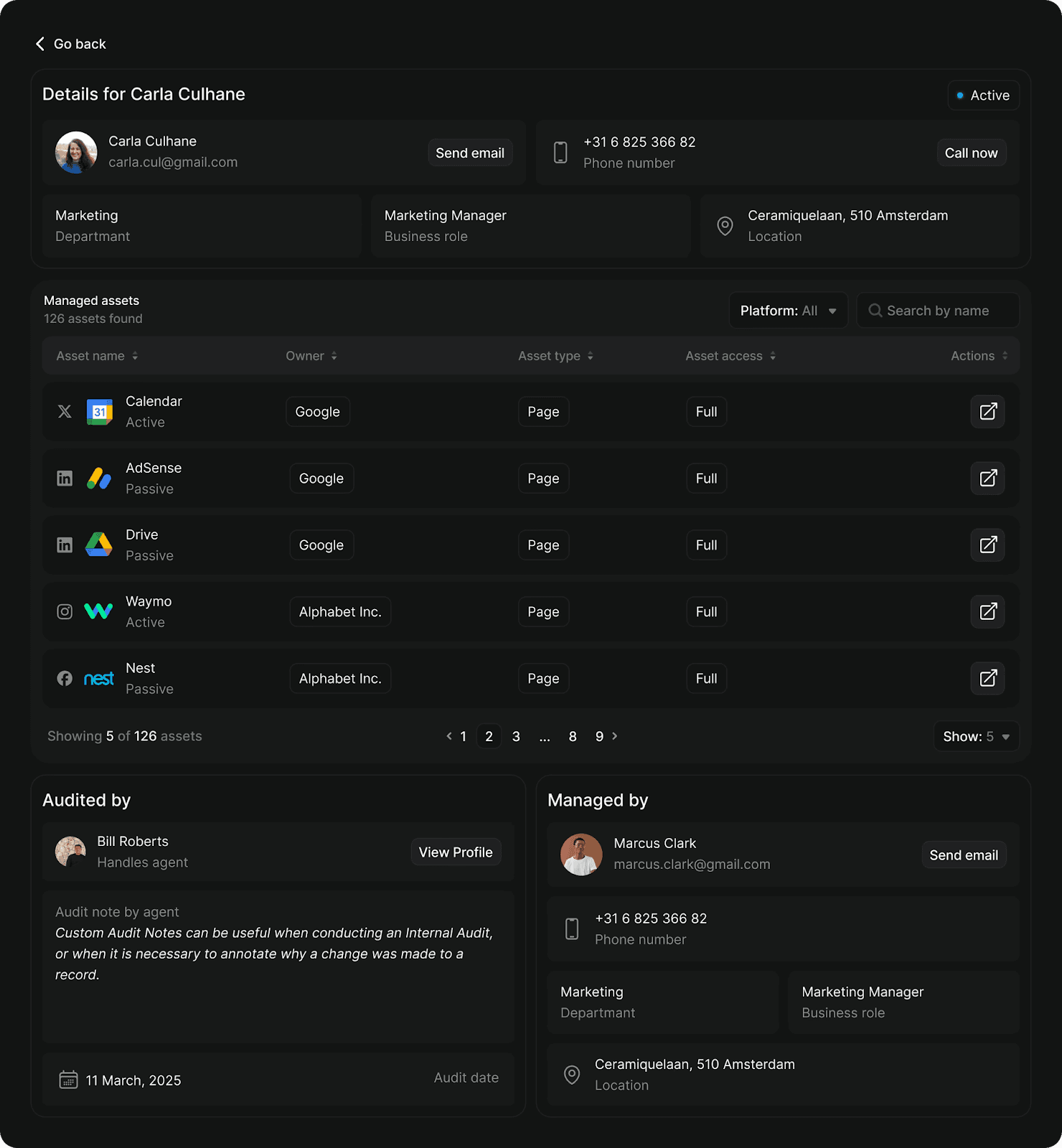 Our platform ingests your org chart and HR data, monitors permissions across Meta, LinkedIn, TikTok, YouTube, and other platforms continuously, and flags anomalies the moment they appear: